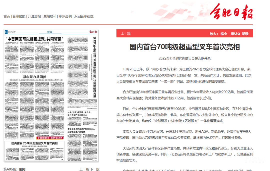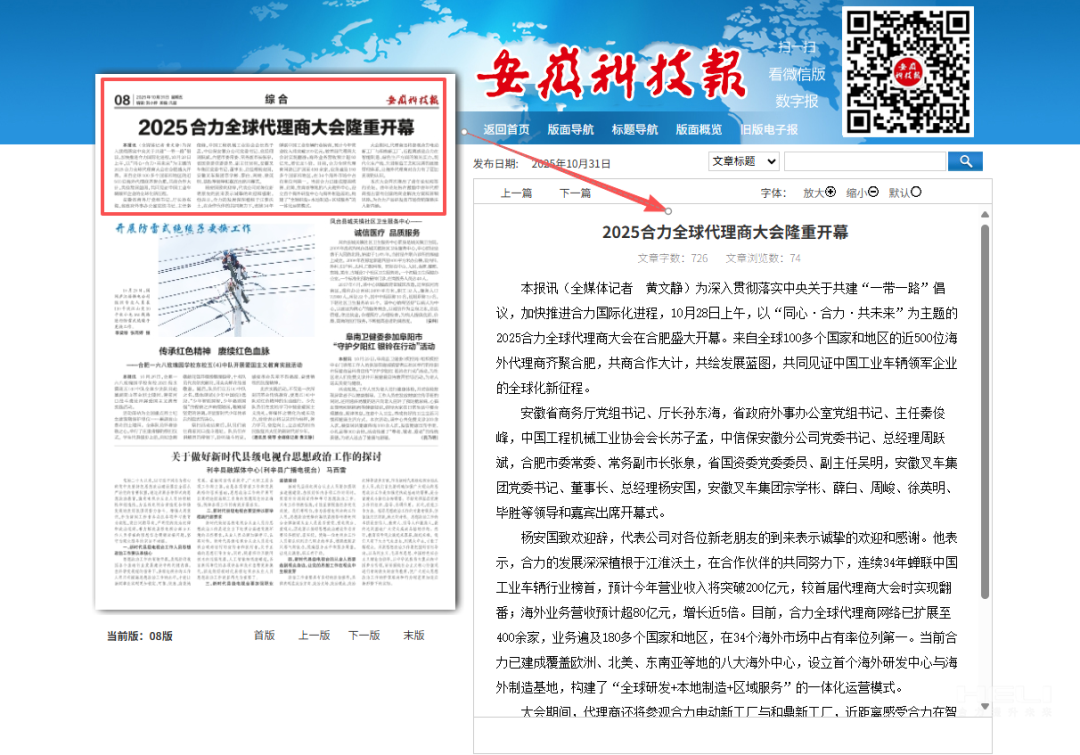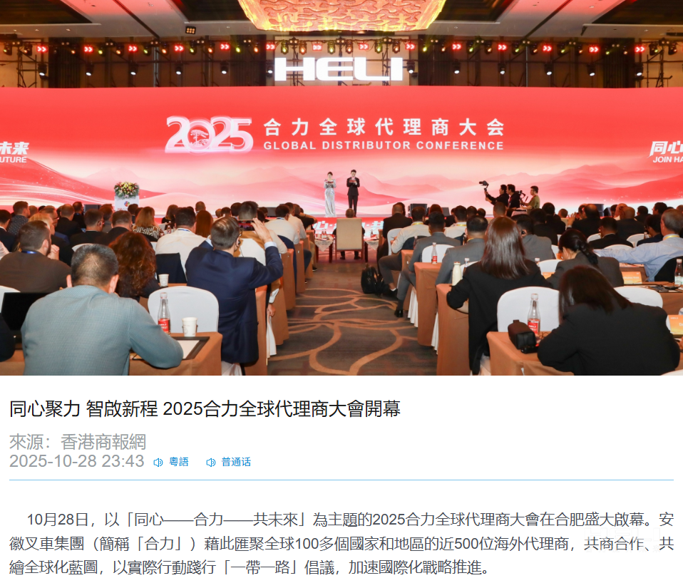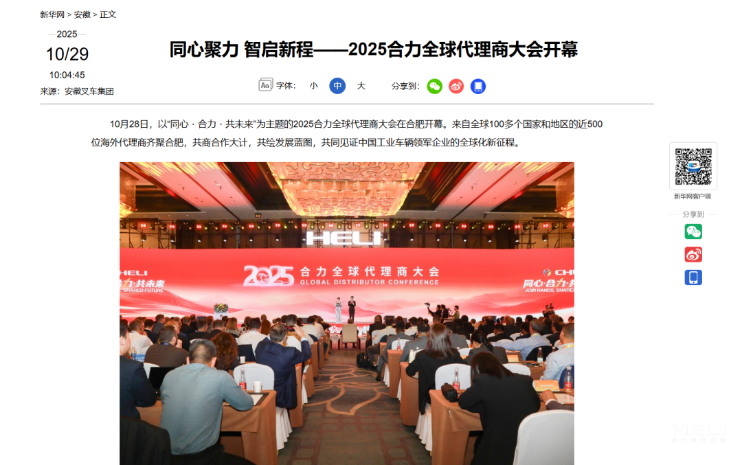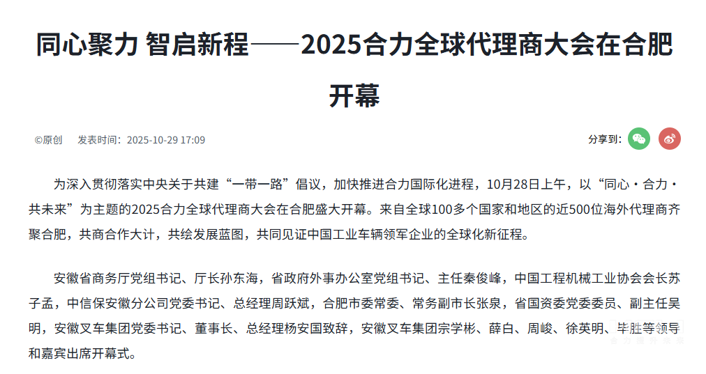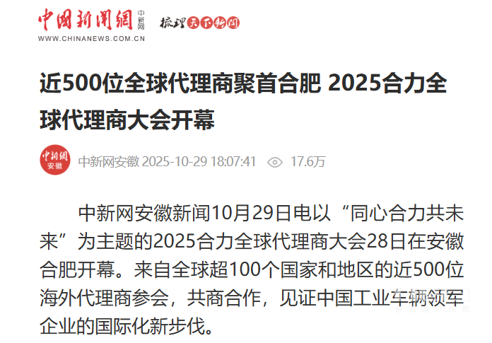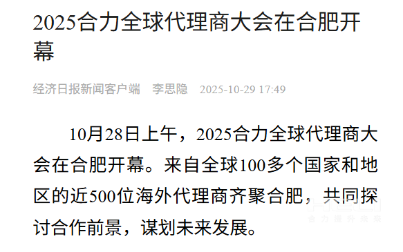 10月28日至31日,“同心?合力?共未來”2025合力全球代理商大會在合肥召開,引發媒體廣泛關注,新華社安徽分社、中央廣播電視臺安徽總站、經濟日報、證券日報、央廣網、中國工業報、人民網安徽頻道、新華網安徽頻道、安徽日報、安徽新聞聯播等28家媒體、46名記者蒞臨現場。中央、省內外及香港、行業媒體競相報道或轉載報道,內容涵蓋戰略發布、智能成果及全球化布局,形式多元、視角鮮活,立體展現合力“智能+綠色”發展新動能,奏響高質量發展強音。